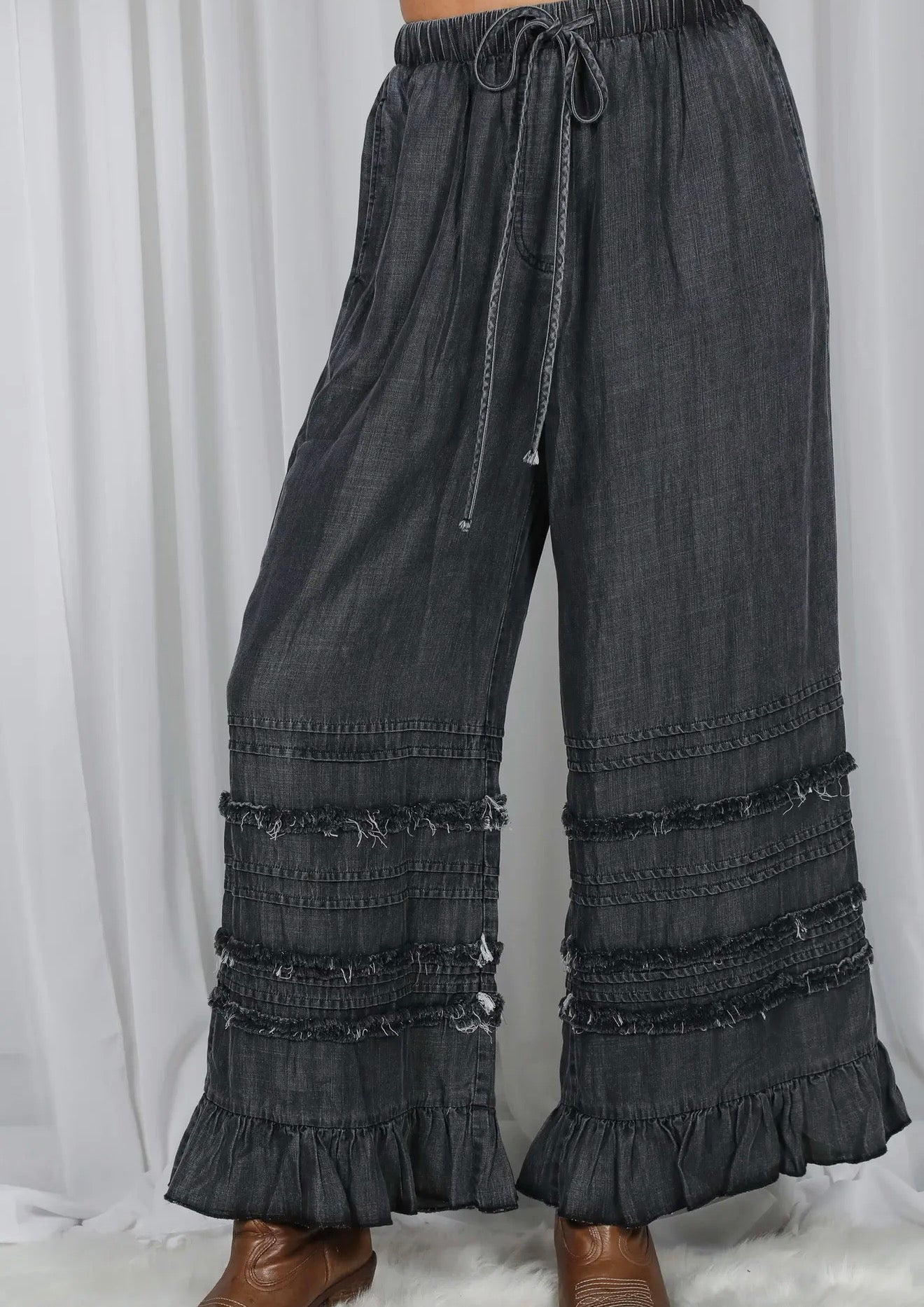 Black Denim Flared Ruffle Pants