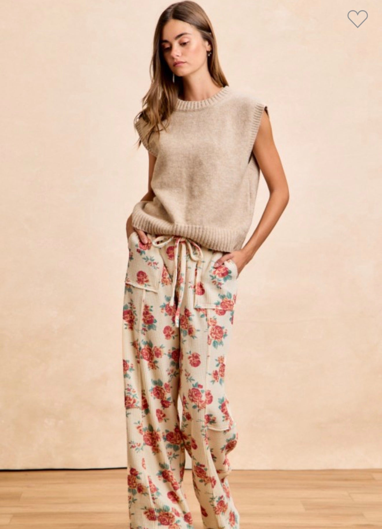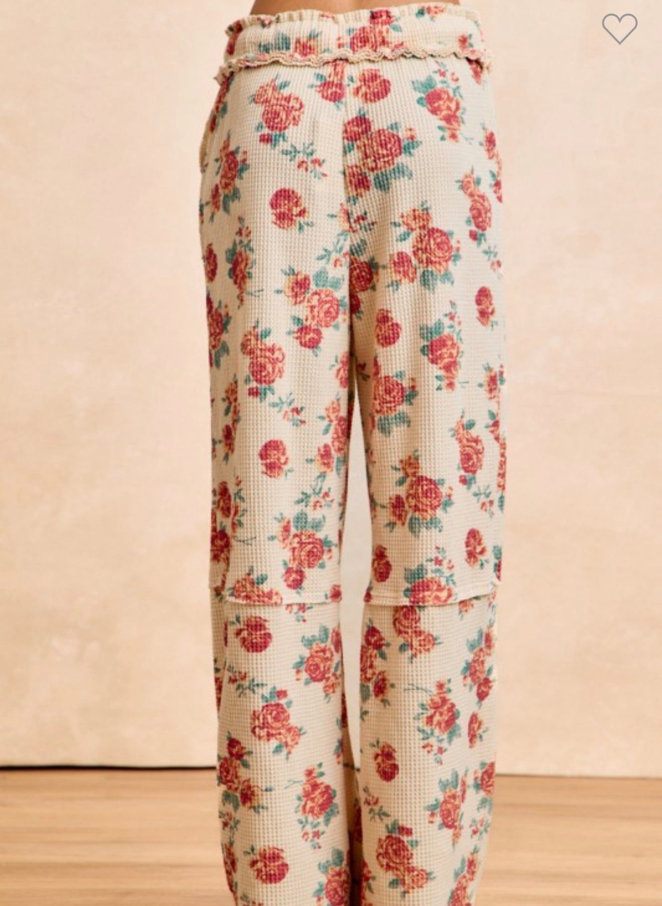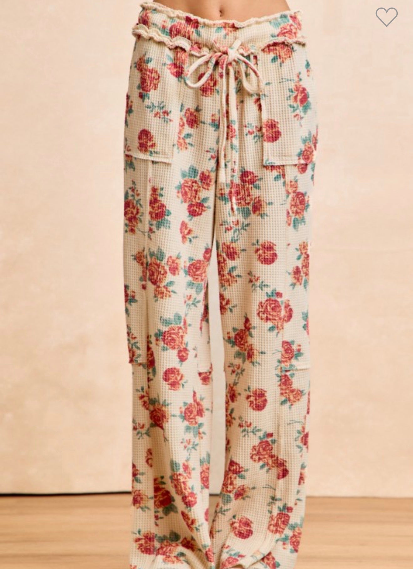 Cream Floral Waffle Wide Leg Pants are crafted from a blend of 65% polyester and 35% cotton, ensuring durability and comfort. The unique waffle texture enhances breathability, while the floral pattern adds visual interest. Ideal for casual or semi-formal settings, these pants offer a versatile addition to your wardrobe.