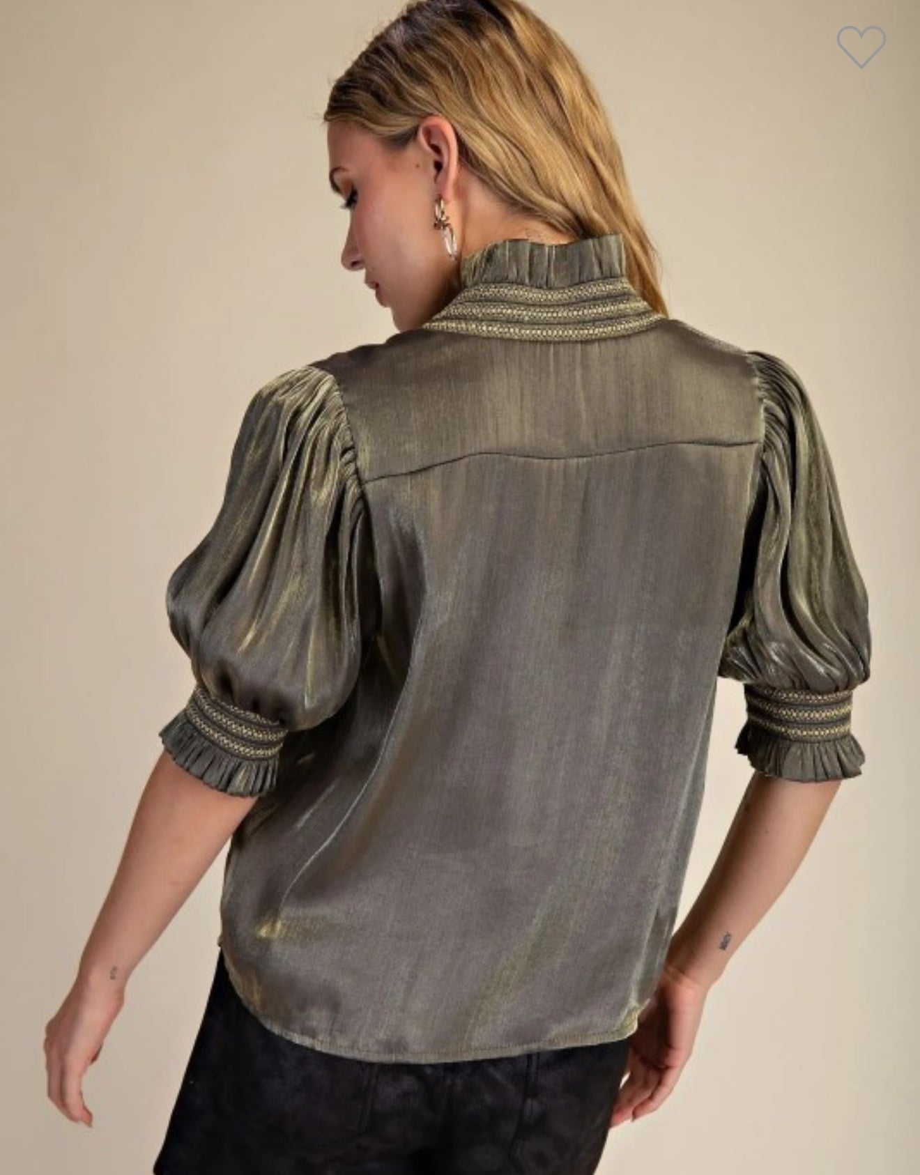 The Olive Holiday Blouse is a must-have for your holiday wardrobe. Crafted from 100% polyester, it features an iridescent look that will catch eyes at any event. The blouse is versatile, making it perfect for dressing up or down. Add a touch of elegance to your holiday outfits with this stunning blouse.Blouse with iridescent satin look. 100% polyester. Great holiday top for special events.