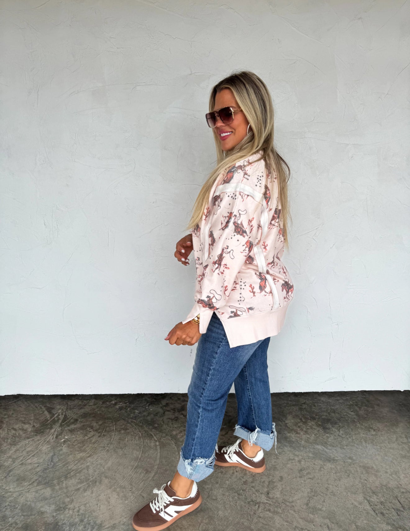 Constructed with a slouchy, relaxed fit and featuring a trendy Western cowgirl design, the Western Ranch Crew Pullover is the perfect addition to your casual wardrobe. The split cuff hem adds a cute touch, while the soft material ensures comfort all day long. Embrace the latest fashion while staying cozy and comfortable.